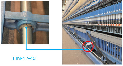 纺织机械细纱机集体落纱装置采用了剪叉式驱动,支撑导杆滑动位置原先采用了金属滚珠直线,但其在纱线毛环境中经常发生卡死问题造成导杆极易拉伤和整个设备运行故障;纺织机械设计工程师在尝试了多种滑动后选择了LIN塑料直线后解决了困扰多年的问题。LIN塑料直线采用了耐磨专家EPB13工程塑料材料制成,不但可以长期免润滑而且运行无任何卡滞风险;LIN塑料直线工作面采用了斜槽设计不但能及时排除摩擦面上的异物而且允许轴在轴向运动的同时可伴随轻微转动。