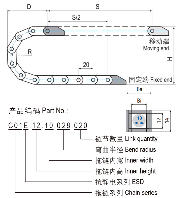 C01E.12抗静电微型塑料拖链体积极小,基于一片式设计重量轻特别适用于高速运动。C01E.12抗静电微型塑料拖链适用于较小安装空间,多种尺寸规格可选。