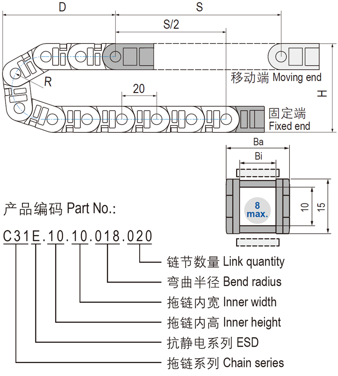 C31E.10抗静电微型电缆拖链可沿内侧或外侧打开,坚固耐用和多种打开方式设计,适用于高速运动。C31E.10抗静电微型可打开电缆拖链适用于较小安装空间,多种内宽规格可选。
