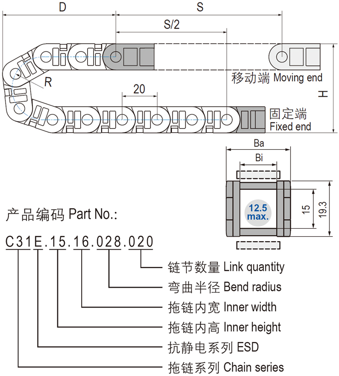 C31E.15抗静电微型电缆拖链可沿内侧或外侧打开,坚固耐用和多种打开方式设计,适用于高速运动。C31E.15抗静电微型可打开电缆拖链适用于较小安装空间,多种内宽规格可选。