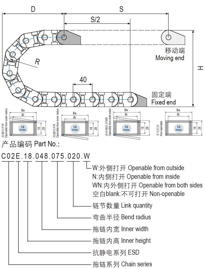C02E.18抗静电通用型塑料拖链是应用范围广泛的产品,简单而多功能的组装结合坚固性,高强度配合更安静的运动,更长的电缆寿命和许多安装选项