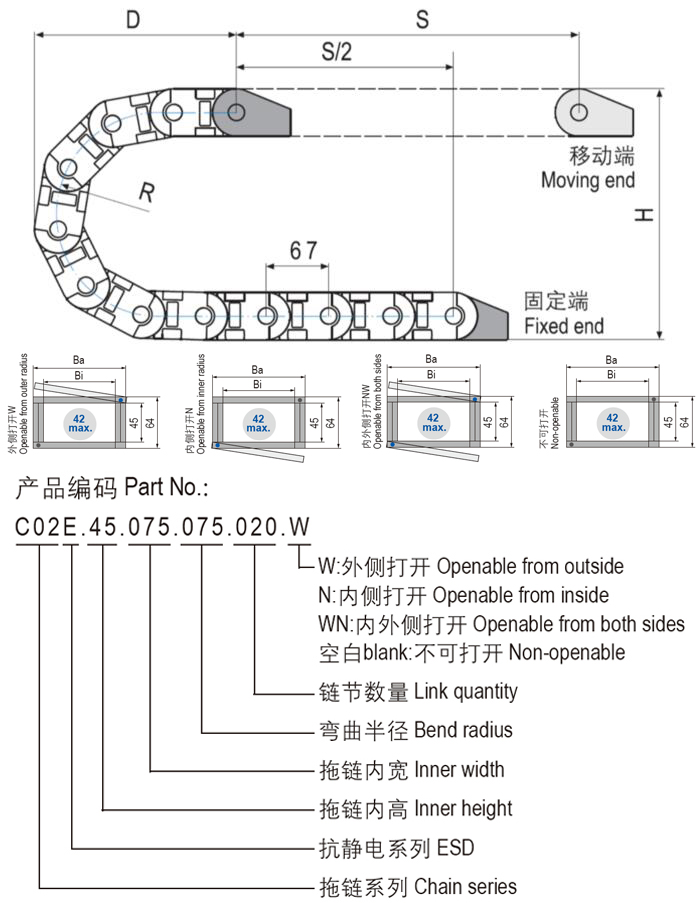 C02E.45抗静电通用型塑料拖链是应用范围广泛的产品,简单而多功能的组装结合坚固性,高强度配合更安静的运动,更长的电缆寿命和许多安装选项