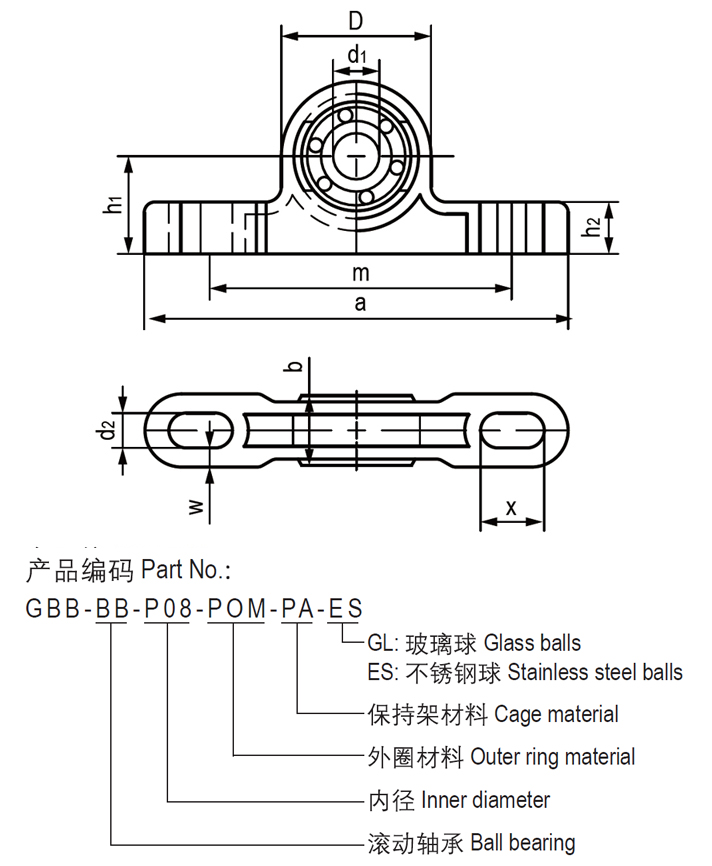 ● 材料:环-POM,保持架-PA,球-不锈钢-ES或玻璃-GL;