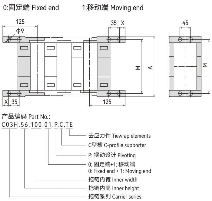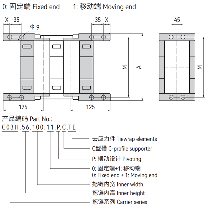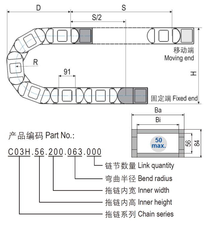 C03H高强度电缆拖链是基于C03电缆拖链的改进版本。高强度材料结合稳固的结构设计使得C03H具有更高的承载能力,特殊横杆设计赋予了拖链内宽尺寸高自由度选择。