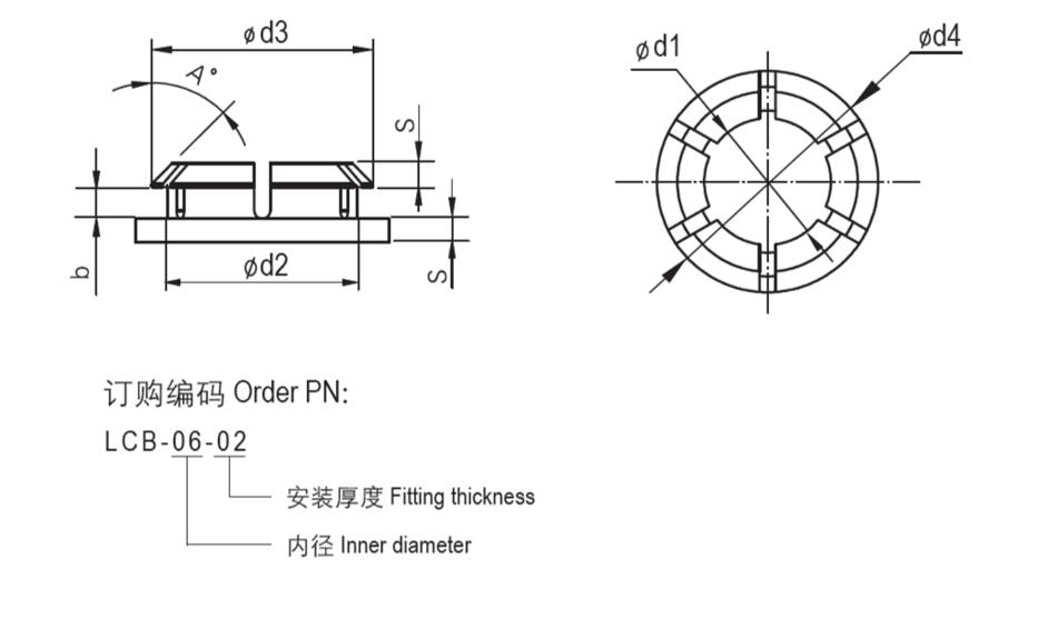 LCB塑料直线卡箍能被较小的压力压入到配合座孔中;标准座孔推荐H7公差,标准轴推荐h9公差。