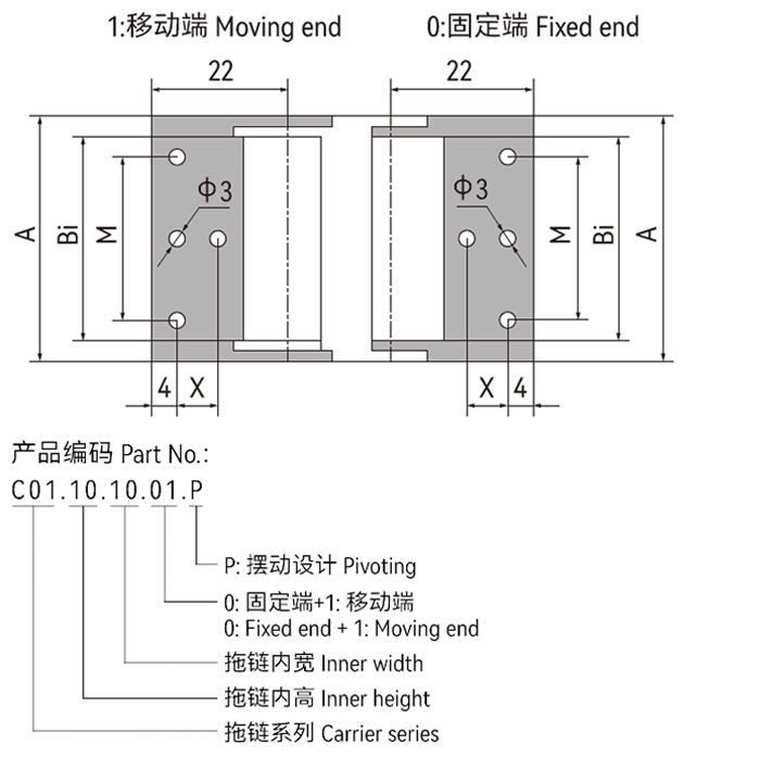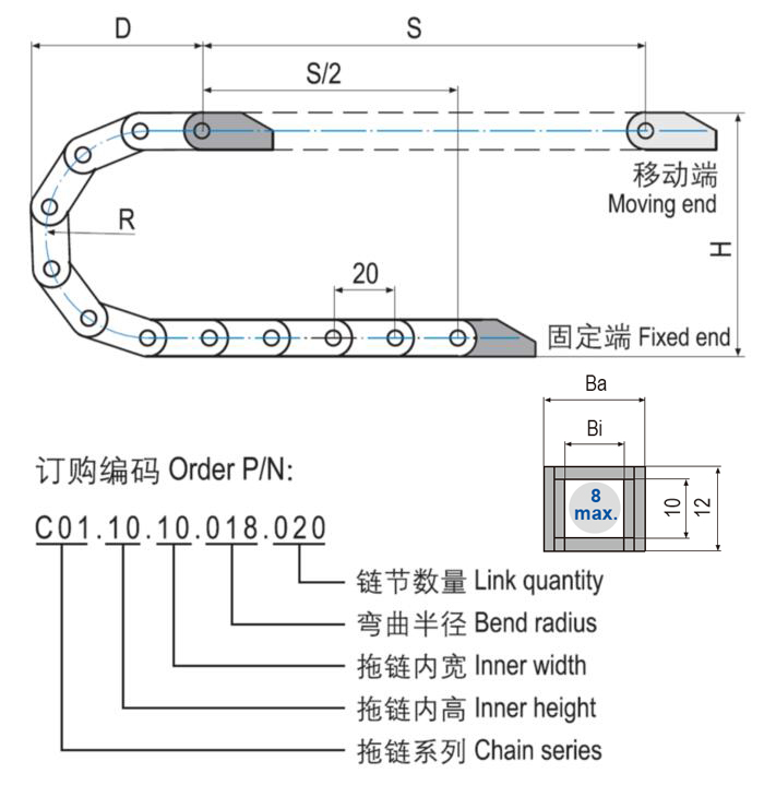 C01.10微型塑料拖链体积极小,基于一片式设计重量轻特别适用于高速运动。C01.10微型塑料拖链适用于较小安装空间,多种尺寸规格可选。
