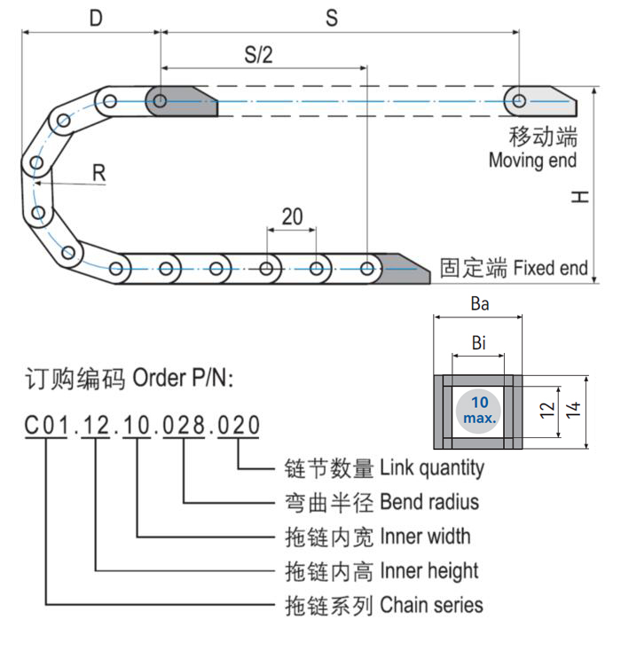 C01.12微型塑料拖链体积极小,基于一片式设计重量轻特别适用于高速运动。C01.12微型塑料拖链适用于较小安装空间,多种尺寸规格可选。