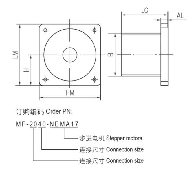 ● 电机法兰用于封闭并保护联轴器,并为NEMA电机提供匹 配的安装尺寸