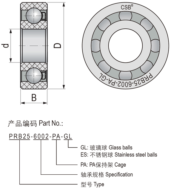 标准配置内外圈材料:改良PA,保持架材料:改良PA,滚珠材料: 玻璃-GL或不锈钢-ES;