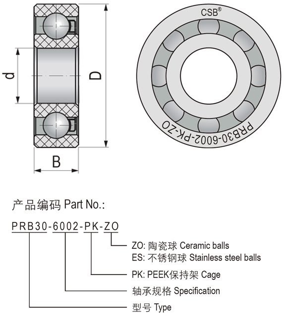 标准配置内外圈材料:改良PEEK,保持架材料:改良 PEEK,滚珠材料:陶瓷-ZO或不锈钢-ES;