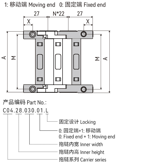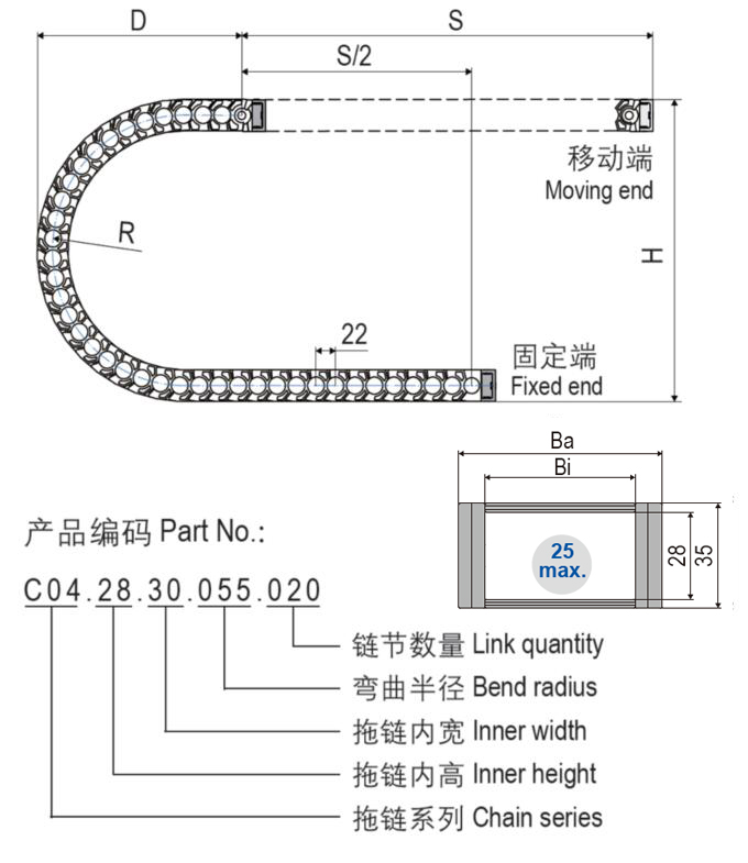 C04.28轻音型电缆拖链采用特殊具有专利结构的转动连接设计,消除了拖链运动中的撞击噪音,且电缆拖链即使在高速运动中也能保持平稳无振动.